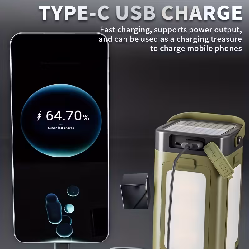 Разработанный для кемпинга, рыбалки и аварийного освещения этот компактный портативный фонарь имеет встроенную солнечную панель и раскладные светодиодные панели. С противоскользящей ручкой и корпусом из ударопрочного ABS/PC материала смартфон легко переносить, а порт Type-C обеспечивает быструю подзарядку и функцию power-bank для зарядки смартфона. Индикаторы заряда показывают уровень батареи в 25/50/75/100%, а центральный прожектор работает как фонарь и дает широкую заливку света. Устройство идеально подходит для путешествий, поскольку оно совместимо с солнечной зарядкой и источниками энергии USB.
