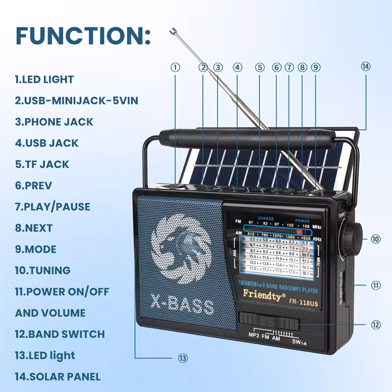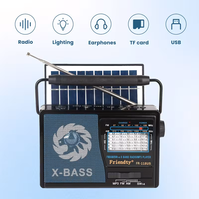 Цей компактний радіоприймач має корпус з міцного ABS-пластика та металеву ручку, телескопічну антену і вбудовану сонячну панель для підзарядки в польових умовах. Розрахований на відтворення MP3 через USB або TF-карту, прийом FM/AM та прослуховування радіо навіть без повністю висунутої антени завдяки чутливому приймальному модулю. LED-ліхтар забезпечує базове підсвічування при ранковій чи вечірній риболовлі, а порт Type-C дозволяє швидко заряджати пристрій від павербанка або сучасних адаптерів. Звук має невелику деформацію на високих рівнях гучності, проте функція X-BASS додає об’ємності під час відтворення музики.