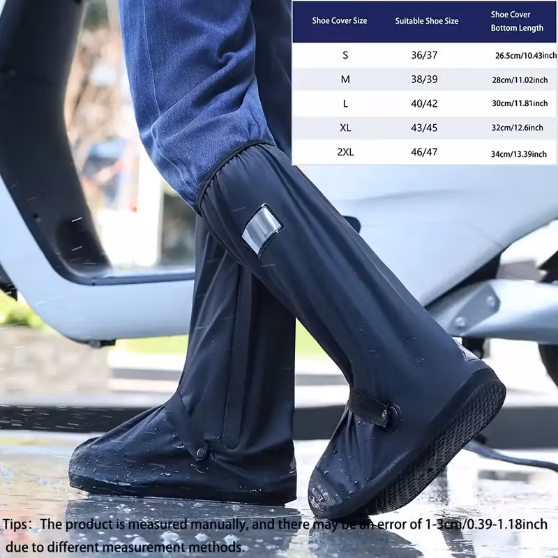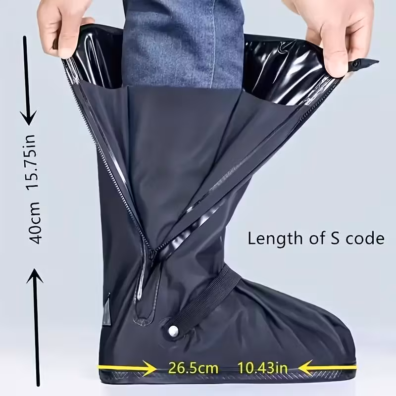 Водонепроникні накидки на взуття в розмірі 42–45 виготовлені зі щільного ПВХ і мають підсилений зовнішній шар, щоб забезпечити тривалий термін служби. Загущена підошва з рельєфним протектором захищає взуття від вологи та механічних пошкоджень на мокрих каменях, гальці та болотистих берегах. Конструкція з боковою блискавкою, кнопкою та регульованим ремінцем гарантує, що нога залишається щільно прикріпленою, а бруд і пісок не потрапляють туди. Накидки легкі (близько 250 г) і компактні, що роблять їх зручними для носіння в рюкзаку під час риболовлі та коротких походів.